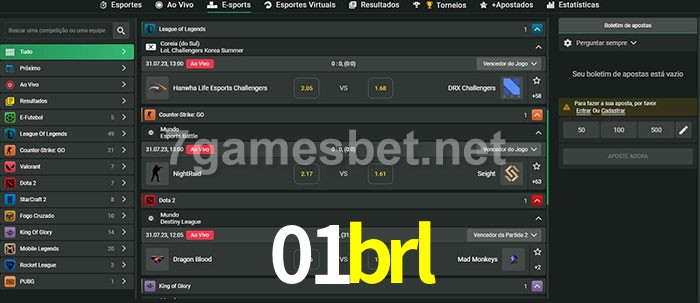 O 01brl oferece uma grande seleção de opções de apostas em e-sports com probabilidades competitivas